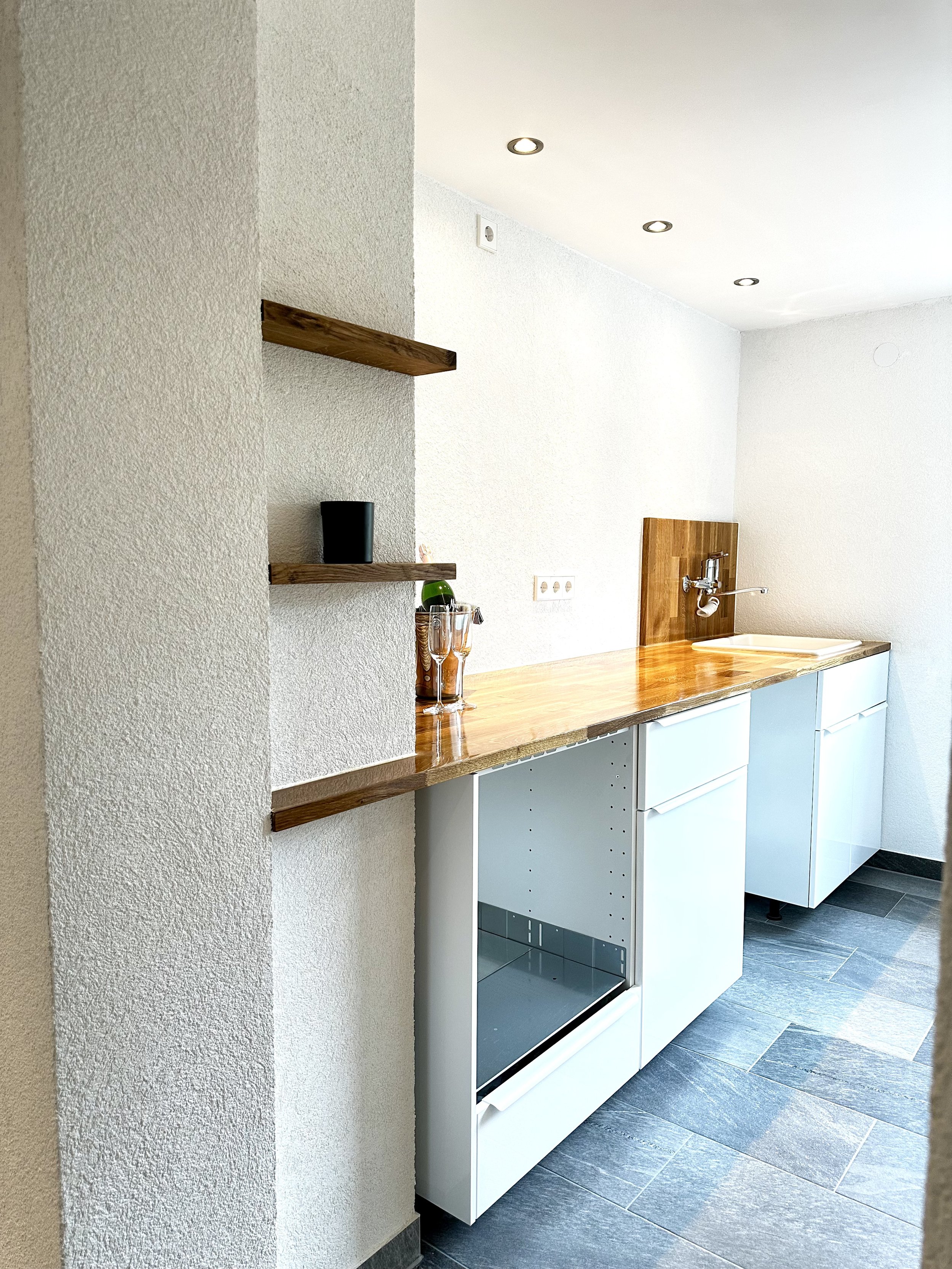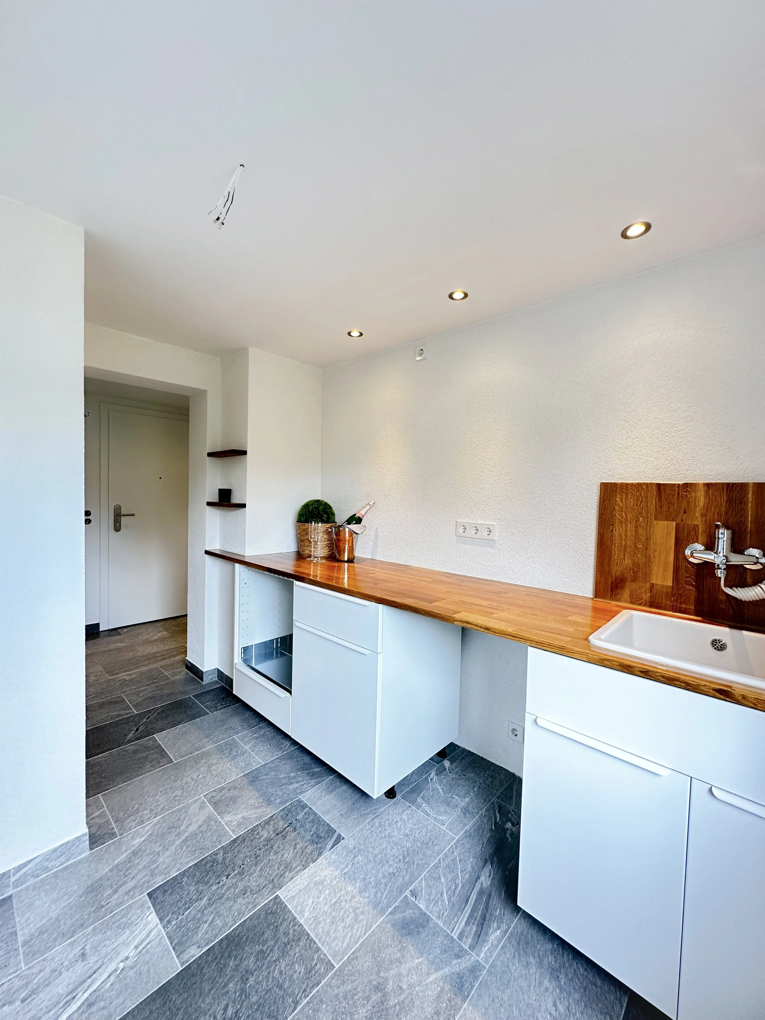 Die knapp 45 Quadratmeter große Wohnung aus dem Baujahr 1960 wurde durch eine umfangreiche Sanierung zurück in die Moderne geholt. Durch leichte Grundrissanpassungen konnten im Souterrain helle und modern anmutende Räume geschaffen werden. Das Highlight in der Wohnung ist das neue Badezimmer. Durch die Neuanordnung der Sanitärgegenstände konnte der kleine Raum effizient genutzt werden und bietet den Eigentümern so eine wahre Wohlfühloase.