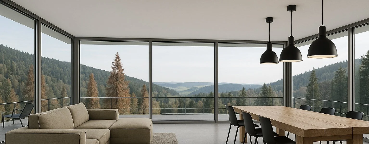 Ein besonderes Highlights bilden die großzügigen Glasfronten, die das Panorama des Schwarzwaldes in jeden Wohnraum holen.